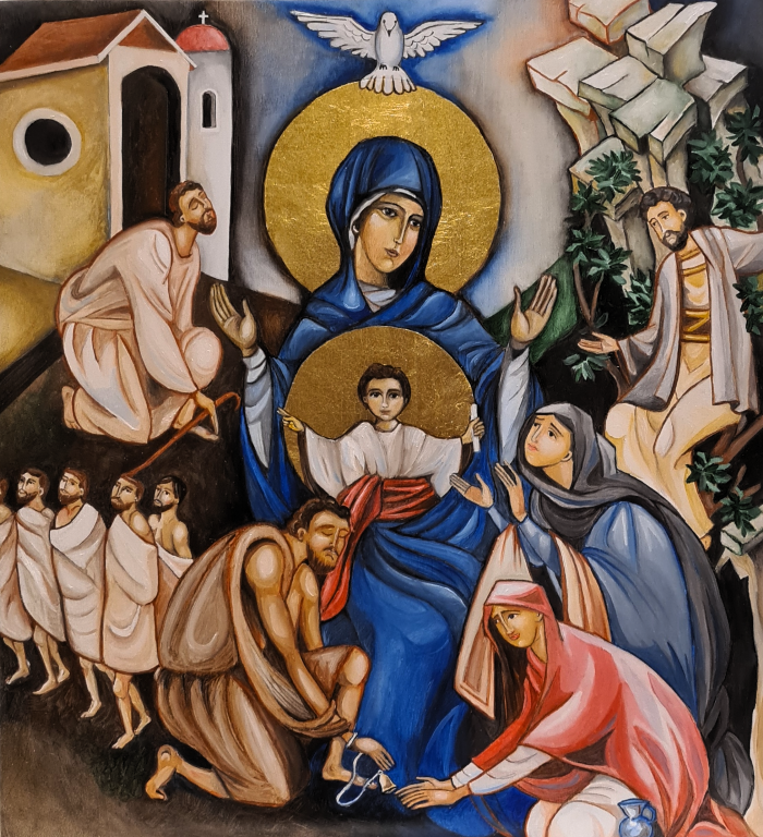 The lepers, depicted in various stages of healing, embody the prayer of thanksgiving. Their story (Lk 17:11–19) culminates in the one who returns to glorify God. In the icon, a single leper is shown at the feet of the Orante, symbolizing the one who came back to thank Jesus for his healing, while the others are shown walking away. Yet another interpretation can be drawn from this detail: the lepers’ outward movement suggests that true gratitude naturally flows into mission, the healed become heralds of mercy. Their pale garments recall baptismal renewal and the reintegration of the sinner into the communion of the Church.
