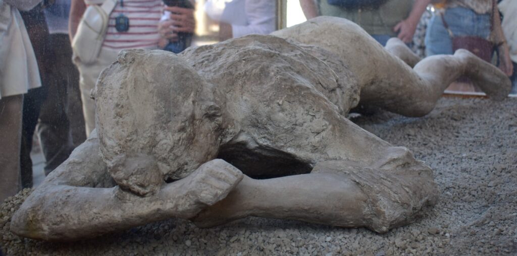 Photo of cast of a woman – one can clearly see her vestments and positioning herself to hide from the clouds of ashes.